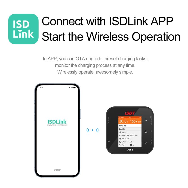 ISDT Air8 Lipo Battery Charger, Balance Charger Discharger 20A 500W DC 1-8S LCD Display Digital Smart Battery Balance Charger Li-Po Li-Hv Li-Ion Li-Fe NiMH Ni-Cd Pb