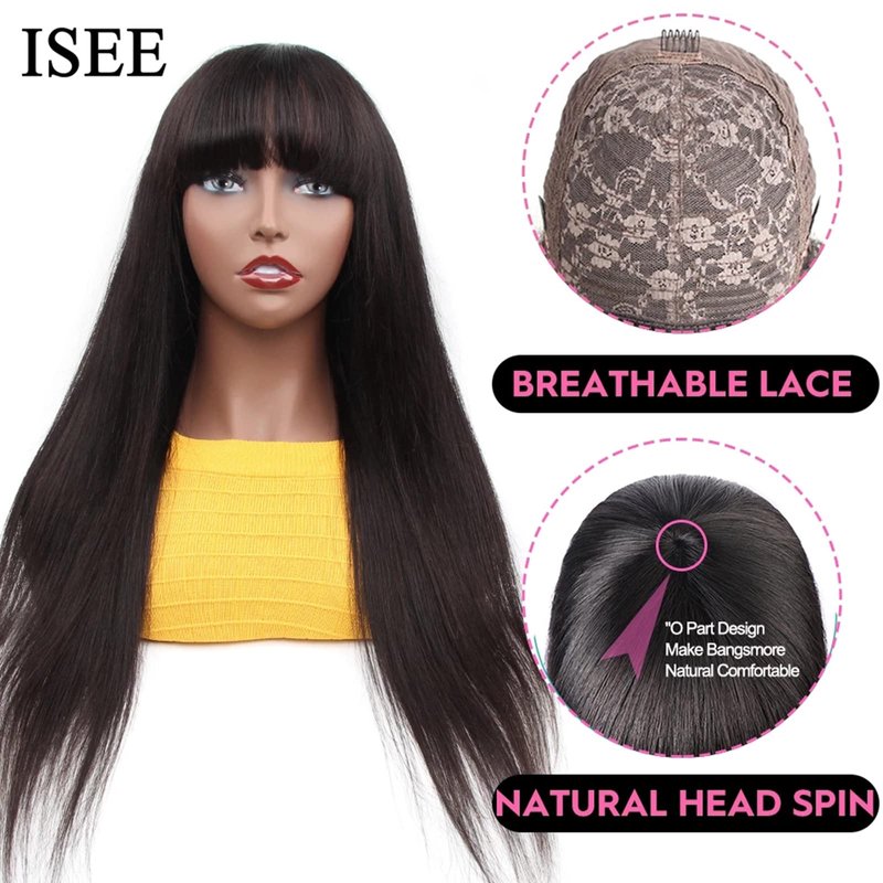 ISEE Hair Human Hair Wigs with Bangs 180% Density Straight None Lace Front Wigs Glueless Machine Made Wigs for Black Women Natural Color (20inch, Straight Wigs)