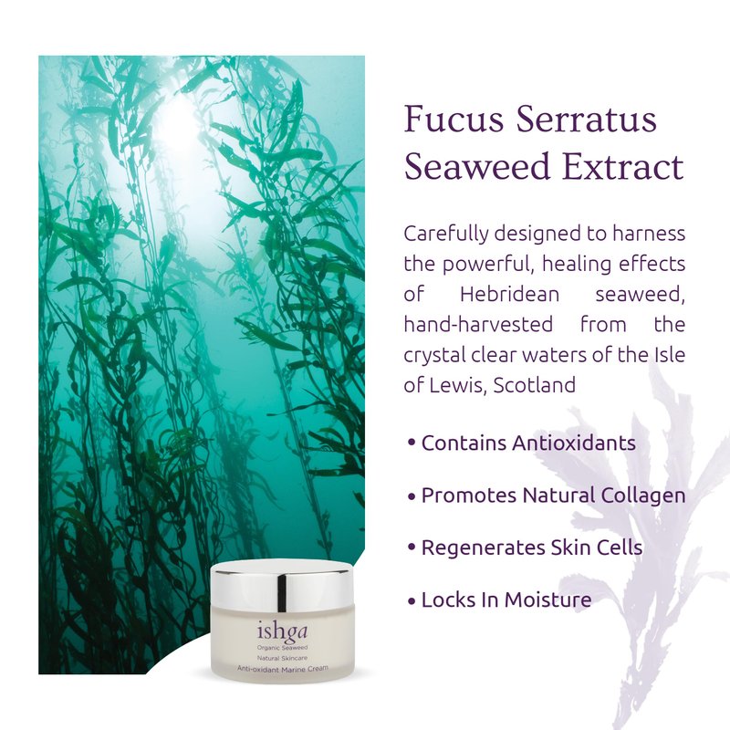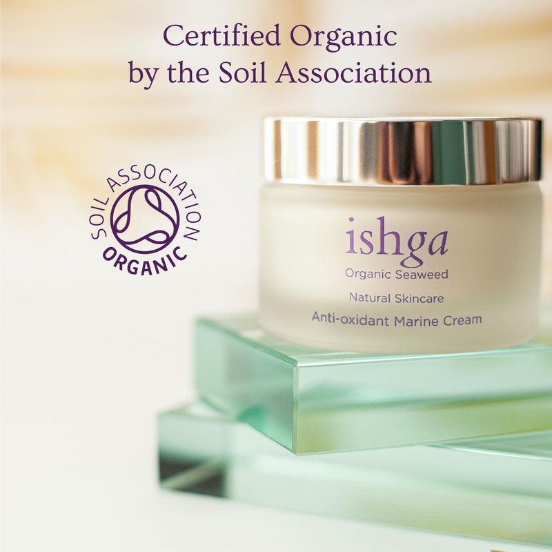A revolutionary organic moisturiser, ishga Anti-oxidant Marine Face Cream is full of natural goodness, and will transform any skin type or stubborn problem, while brightening, freshening and smoothing any wrinkles. A powerful blend of clean, natural skincare ingredients, it includes ishgaโs unique seaweed extract and legendary Scottish spring water, which together yield 86 vitamins and minerals. Shea butter and extract of macademia contain essential fatty acids Omega 6 and 7, which absorb excess sebum while nourishing thirsty skin. Vitamin E plumps, heals and smooths, and calming bergamot extracted from citrus peel combats oil, detoxifies the skin and keeps it clean and fresh. This beautiful light, luxury cream comes in two sizes, a larger 50ml glass jar and a smaller 30ml size, perfect to travel with or try for the first time. ishga Anti-Oxidant Marine Face Cream is true to the principles of vegan skincare and all our ingredients are Organic certified by the Soil Association. Sustainable, cruelty-free skincare that is planet-friendly.
