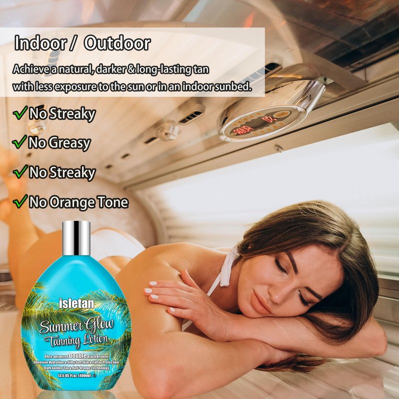 - DHA Free. isletan indoor tanning bed lotion & sun tanning lotion speeds up the tanning process while you bask in the sun or use a tanning bed, delivering natural golden glow results without any use of DHA or fake processes. The tan accelerator bronzer for outdoor sun & tanning beds activates the melanin in your skin so you get tanned faster but it doesn’t make you orange, indoor tanning bed lotion & outdoor sun tanning lotion just makes you get to your natural tanned color.