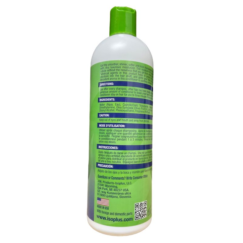 Isoplus Extra Virgin Olive Oil Conditioner softens and detangles, this moisture-rich conditioner helps to smooth the cuticle without the heaviness that you get from other conditioners. The combination of botanical agents in this product helps to protect the hair from heat styling, locks moisture into the hair shaft, and gives your hair the gloss and body it needs. The decadent aroma in this conditioner is soothing and will not overpower your senses.