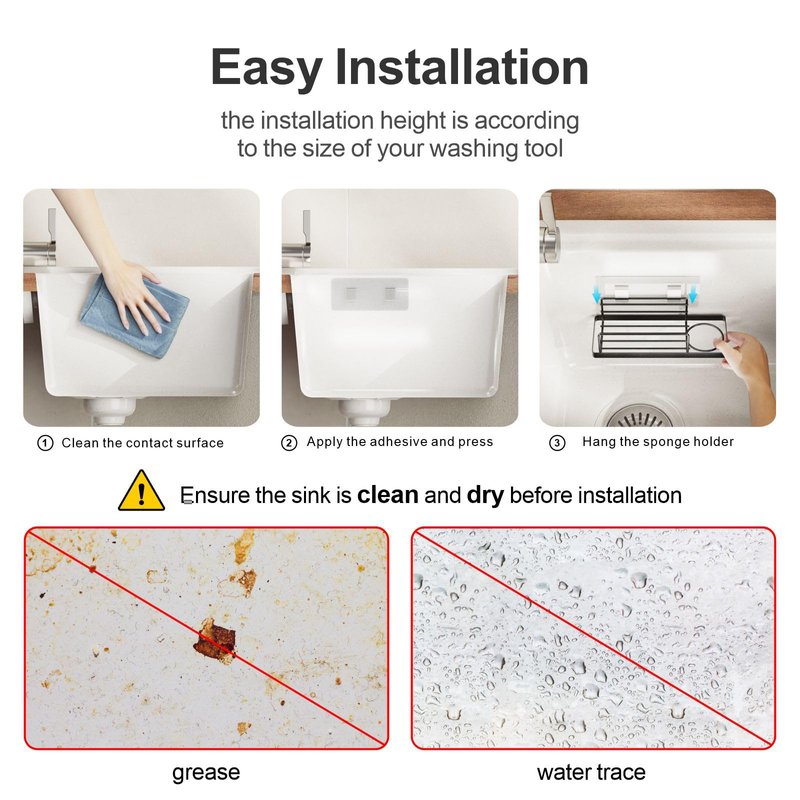 - Hassle-Free Installation: No tools required. Just wipe the contact surface, peel the traceless adhesive, press firmly, then hang the sponge holder. However, a dry and clean sink surface is key prior to installation. For adhesive removal, diligently follow the provided instructions.