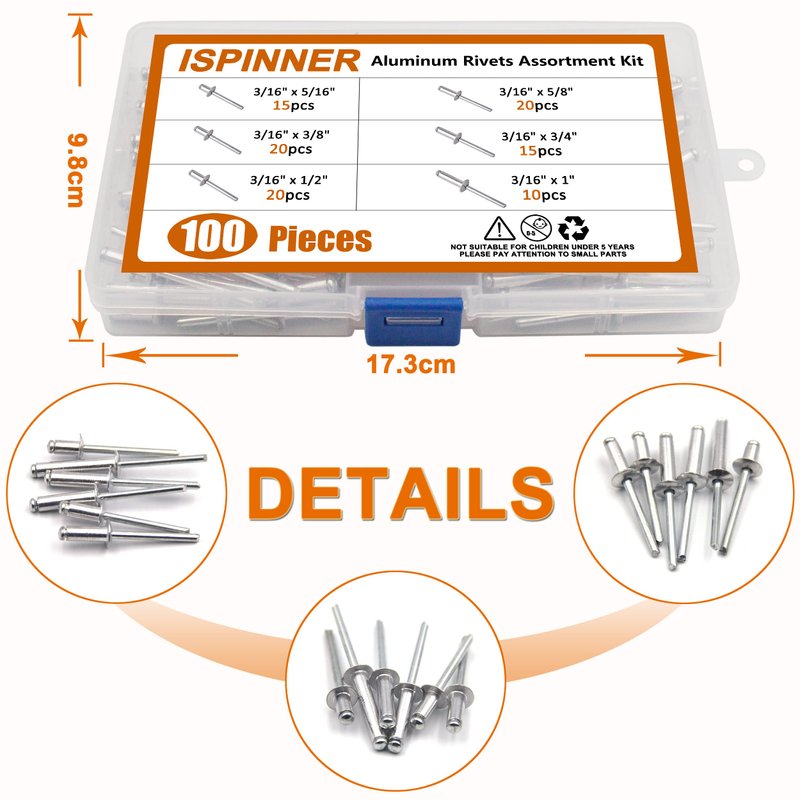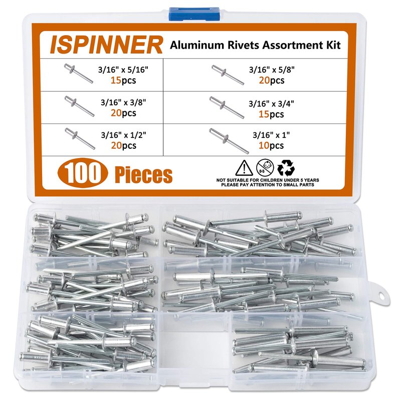 ISPINNER 100pcs 6 Sizes Aluminum Blind Rivets, Pop Rivets Assortment Kit 3/16" x (5/16" 3/8" 1/2" 5/8" 3/4" 1")(Silver)