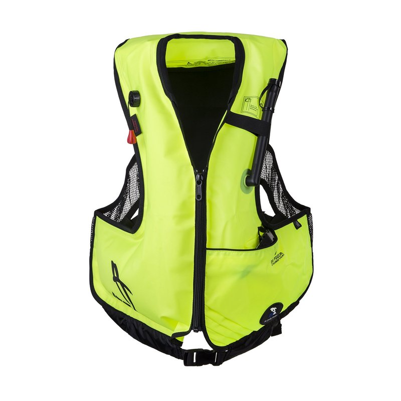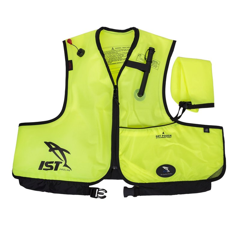 Manufactured with the same technology as a SCUBA diving buoyancy jacket, the new patented snorkeling vest from IST has a tough 420 D nylon exterior, which is coated with TPU on the inside for fail safe operation. Inflation is made easy with a low resistant oral inflation valve which also dubs as a secondary exhaust valve. The primary exhaust is located on the right chest for rapid deflation when needed. Rolled collar with felt lining increases wearer comfort. Special pattern and fastening system eliminates the need for crotch strap and can be worn more comfortably and safely around the body than a traditional design. Comes complete with a pocket and a dry pouch to store small personal items