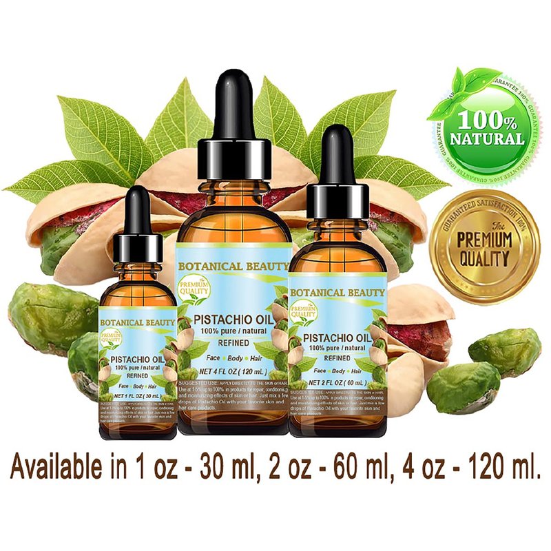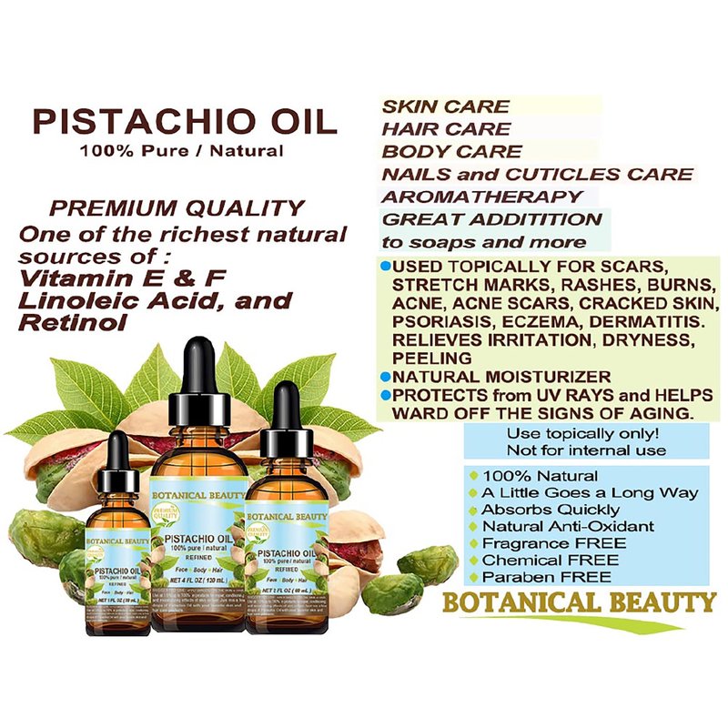 - Botanical Beauty PISTACHIO OIL Pistacia vera is 100% Pure Refined Cold Pressed Carrier Oil with no additives. PISTACHIO NUTS are the richest source of naturally occurring Vitamin E, linoleic, oleic fatty acids and omega 3, omega 6, omega 9. Used for thousands of years for its moisturizing properties. PISTACHIO OIL is one of the best anti aging anti wrinkle face oils.