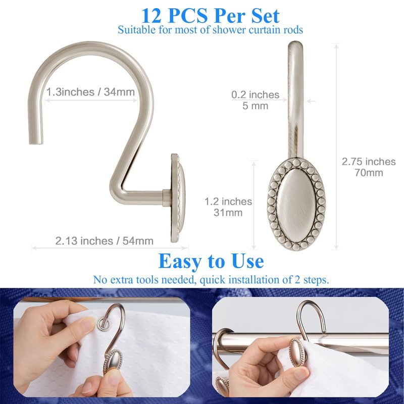 - ONVENIENT & DURABLE: Brushed nickel shower hooks made of rustproof alloy, suitable for most colors and styles of shower curtain rods. It is rust and corrosion-resistant, perfect for the wet bathroom environment.