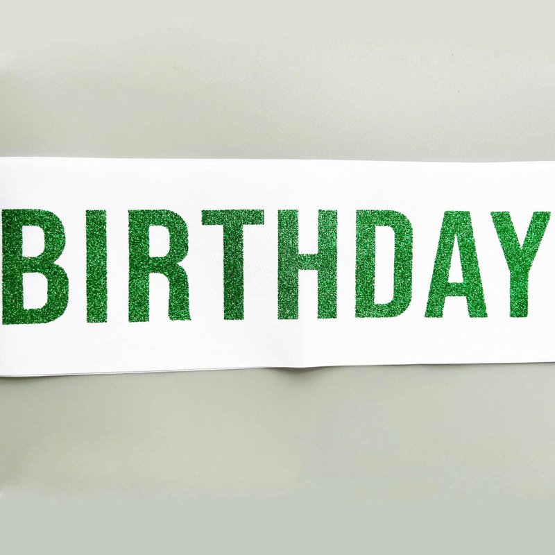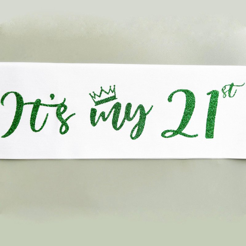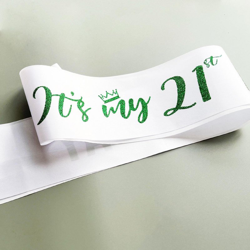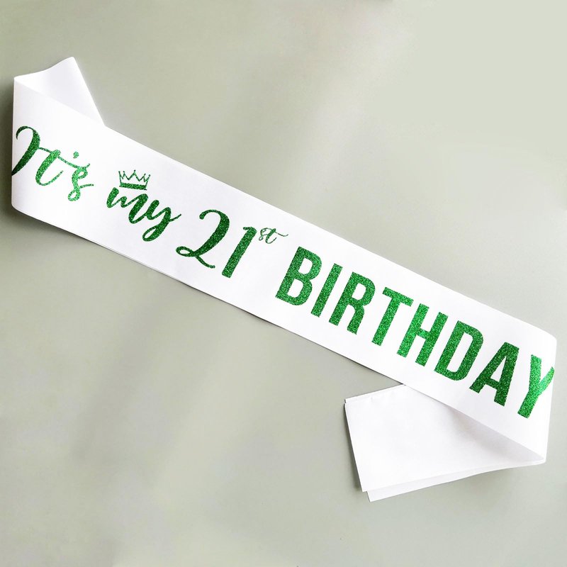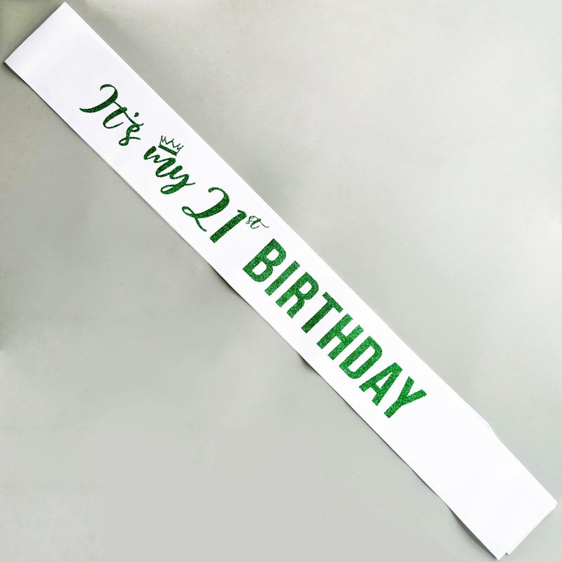 Material: The "It's my 21st BIRTHDAY" sash is made of white soft quality satin sash with green glitter lettering. Color: white sash with green letter Size: 31.5 inches(80cm) length (one side), and 3.74 inches(9.5cm) width.