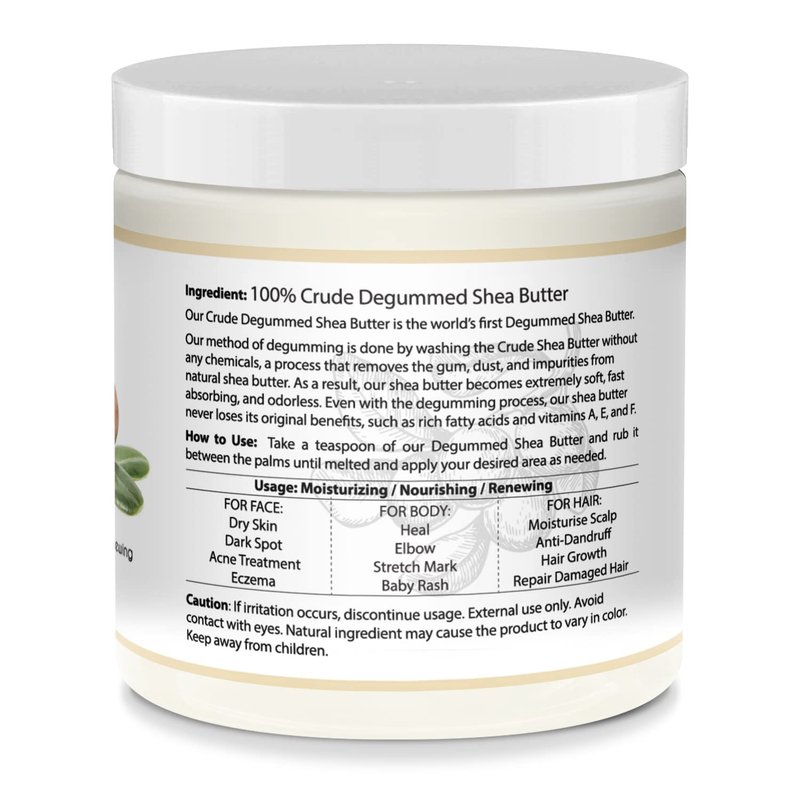 - ✅HOW IT WORKS – Degummed Shea Butter for skin absorbs quickly, penetrates deeply and coats the skin with a fine film thereby diminishing water loss and leaving the skin softened and protected