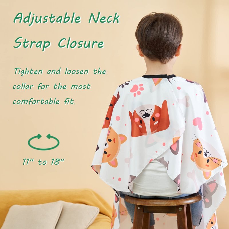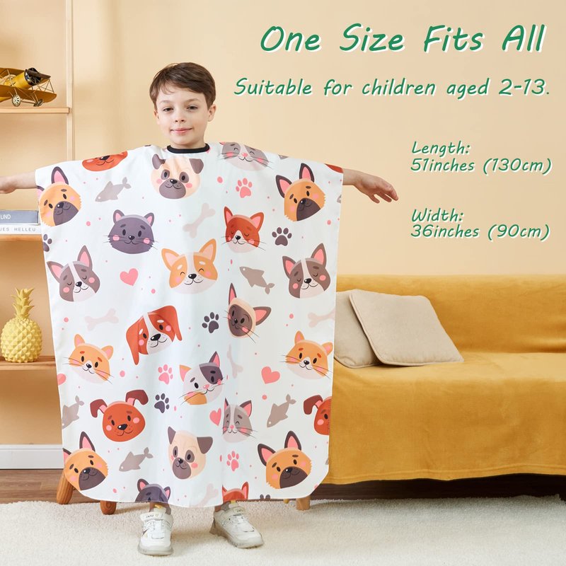 - ❤Cartoon Dog & Cat Pattern❤ Monotonous capes usually too boring for kids, therefore hard to attract them. The tension of haircut will have nowhere to transfer and release. Obviously, such an experience cannot be called pleasant. This time, we designed this cape for kids' own interest. Our children barber cape is filled up with dog and cat pattern, which is lovely and can attract kids’ attention, leads them interacting with cute pets while taking haircut.