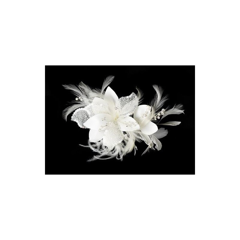 This stunning feather fascinator is the perfect accessory to your modern or vintage wedding. A spray of feathers outline fabric and beaded flower petals. Rhinestones, sequins, and faux pearls add a touch of glamour to the piece. The ornament measures 7" wide and 5" tall, and Comb is 3" wide. Availbale in Ivory color.