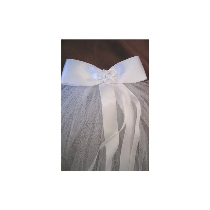 This veil is made of bridal illusion tulle, cut at 16" and 21" length, 72" width, and finished with a beautiful Nylon filament edge. It is decorated with a lovely satin bow and three satin roses. Wire comb attached for wearing under an updo.