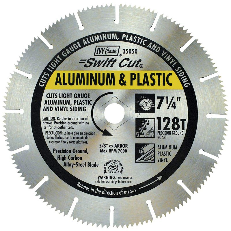 - Steel blade designed for cutting light gauge aluminum, plastic and vinyl siding up to 1/8" thick. For material thicker than 1/8” use IVY Classic 36360 7-1/4” 60T Non-Ferrous & Plastics Blade.
