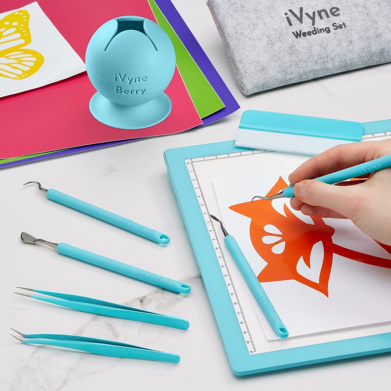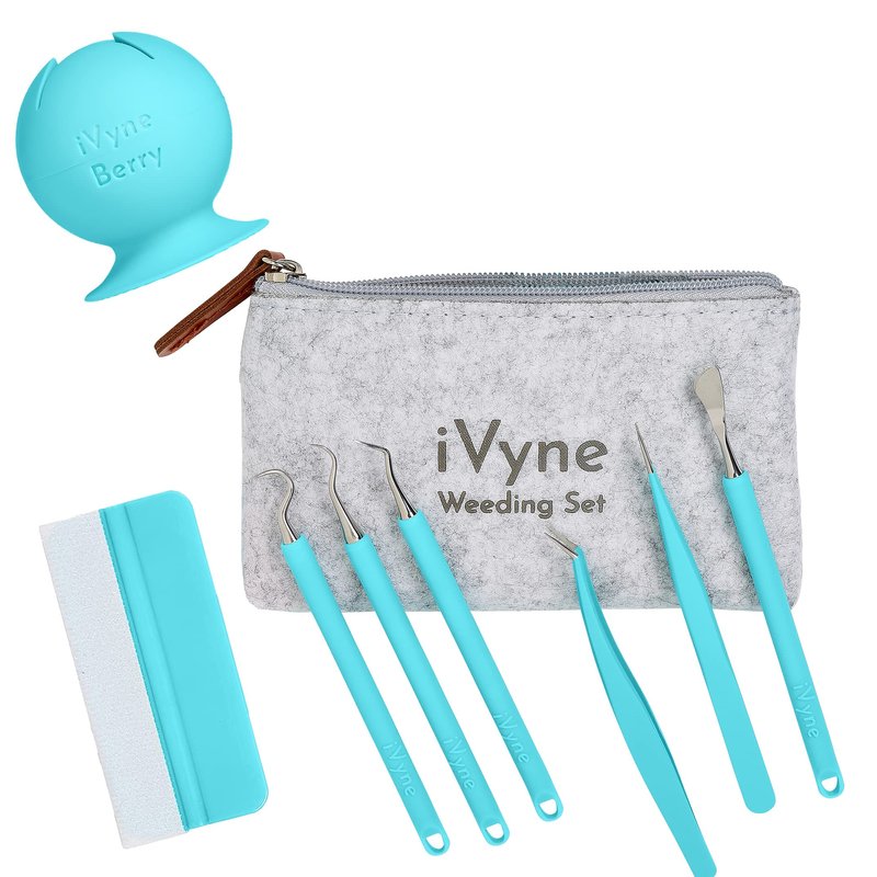 iVyne (8pcs) Premium Vinyl Weeding Tool Kit & Weeding Scrap Collector Soft Grip Tools with Berry, Weeder, Tweezers, Picker Or Hook, and Scraper Set for Silhouette Cameos & Cricut - Blue