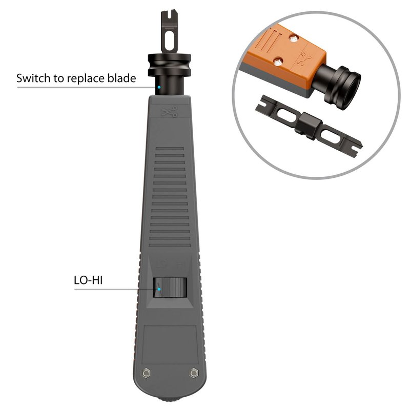 - Selectable (Hi/Low) impact force settings for cable termination into panels and blocks with 110 IDC terminals