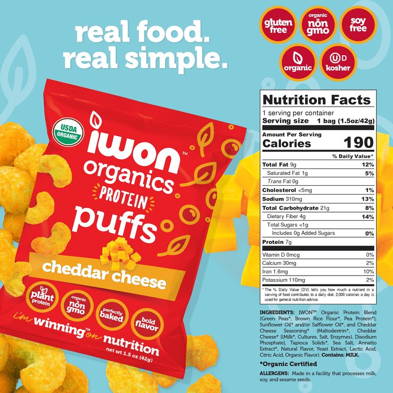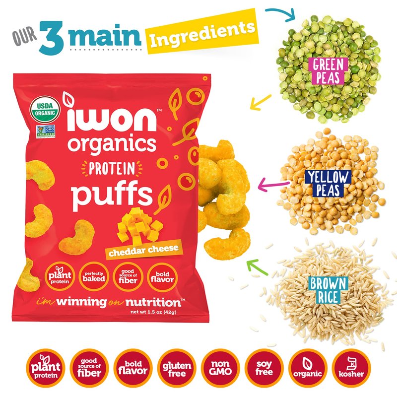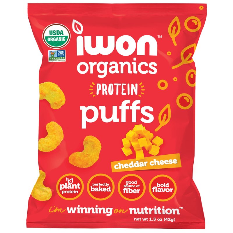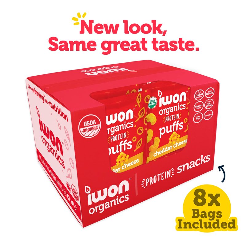 IWON Organics Cheddar Cheese Flavor Protein Puff, High Protein and Organic Healthy Snacks, 8 Bags