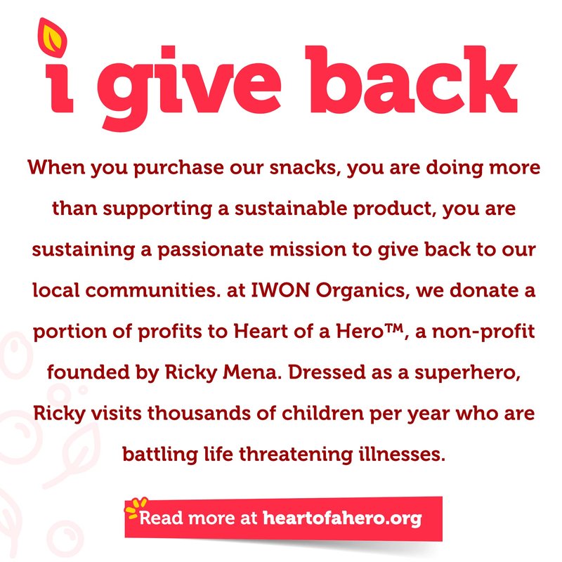 when you purchase our snacks, you are doing more than supporting a sustainable product, you are sustaining a passionate mission to give back to our local communities. at IWON, we donate a portion of profits to Heart of a Hero, a non-profit founded by Ricky Mena. dressed as a superhero, Ricky visits thousands of children per year who are battling life threatening illnesses.