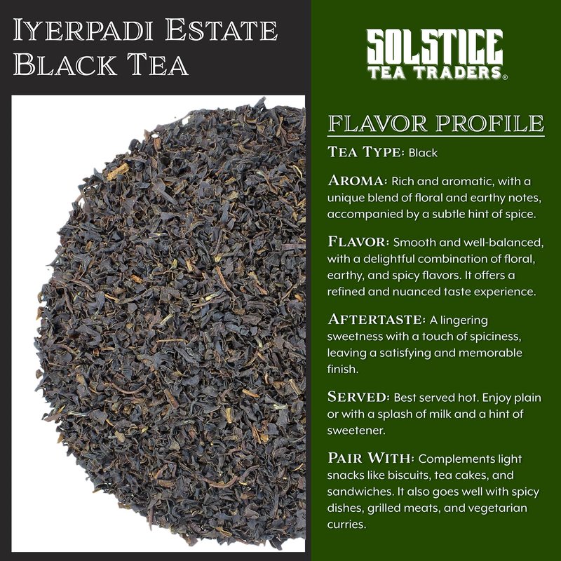 This tea is single origin tea from Iyerpadi Estate in South India. The special growing conditions here (altitude, humidity) make this a perfect tea for making iced tea also. We provide BOP (broken leaf) which brews faster than full leaves great for both convenience and value. (OP refers to orange pekoe which is the color of tea leaf, not a flavor).