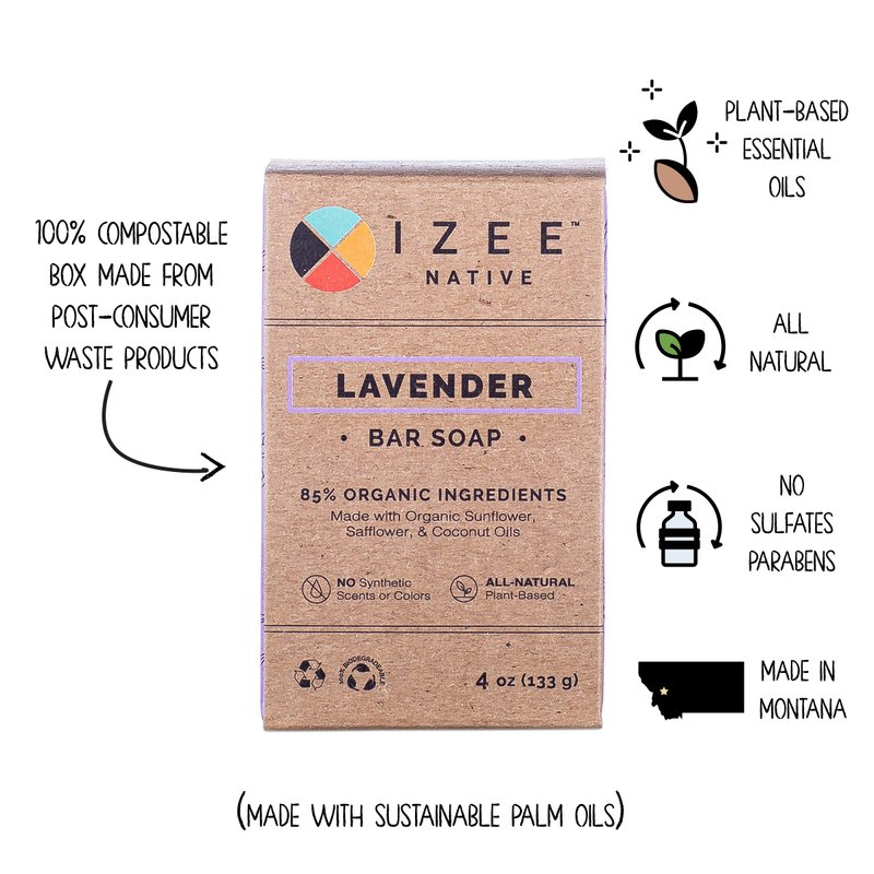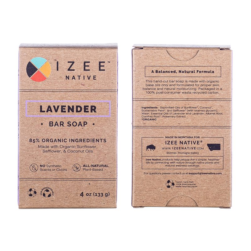 The Lavender Plant has been vastly popular for thousands of years. The benefits of lavender have been accepted and embraced by every civilization moving from the Egyptians to the Romans to Europeans. Modern society, and more specifically Izee Native, is no different. We used all organic ingredients to make the Lavender Bar Soap bring you the essence of it in the form of soap. Our soaps are made in small, handcrafted batches and are hand-cut then packed in boxes made from 100% post-consumer recycled materials. Made in Montana, USA.