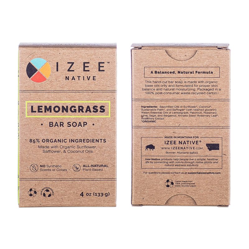 Izee Native Lemongrass Bar Soap: Lemongrass, a clean lemony smelling plant, has been used to scent cleaning supplies and act as a staple ingredient in the kitchen for countless years. Originating in Sri Lanka, South India, and the tropical regions of the Americas and Asia, Lemongrass is a favorite for much of the cuisine in those parts of the world. But more than just an ingredient within the traditional dishes, lemongrass has established itself as a medical foundation and favorite. Its many characteristics lend themselves to making lemongrass indispensable to the population that relies upon natural healing methods and has for thousands of years. We used all organic ingredients to make the Lemongrass Bar Soap and bring you the essence of it in the form of soap. Our soaps are made in small, handcrafted batches and are hand-cut then packed in boxes made from 100% post-consumer recycled materials. Made in Montana, USA.