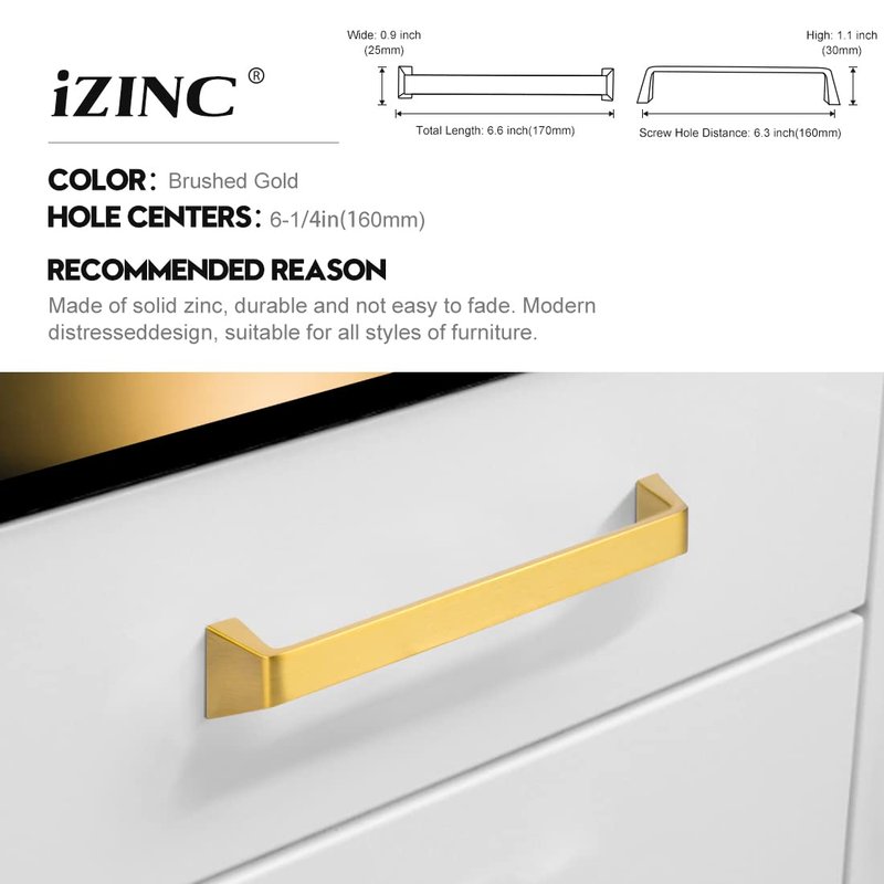 iZINC 5 Pack Solid Zinc Glod Drawer Pulls,6 1/4 Inch/160mm Brushed Gold Cabinet Pulls,Modern Dresser Handles,Kitchen Hardware for Bathroom and Cabinet