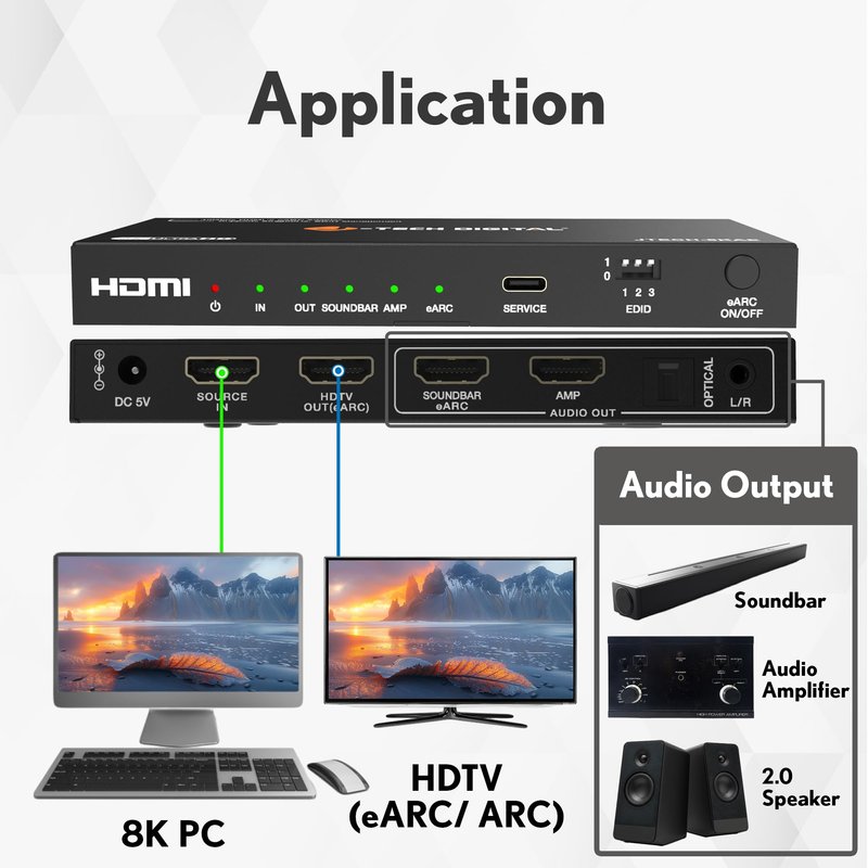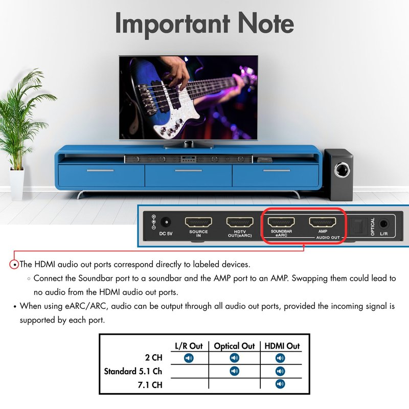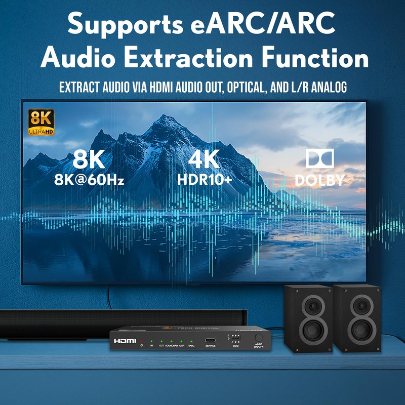 - ✅ eARC / ARC Audio Extraction Function: Easily extract audio signals from your 8K@60Hz, 4K@120Hz HDMI source, ARC, or eARC enabled TV. Send the audio signal directly to your sound system, AV receiver, or amplifier through Optical SPDIF, L/R analog, or HDMI audio outputs