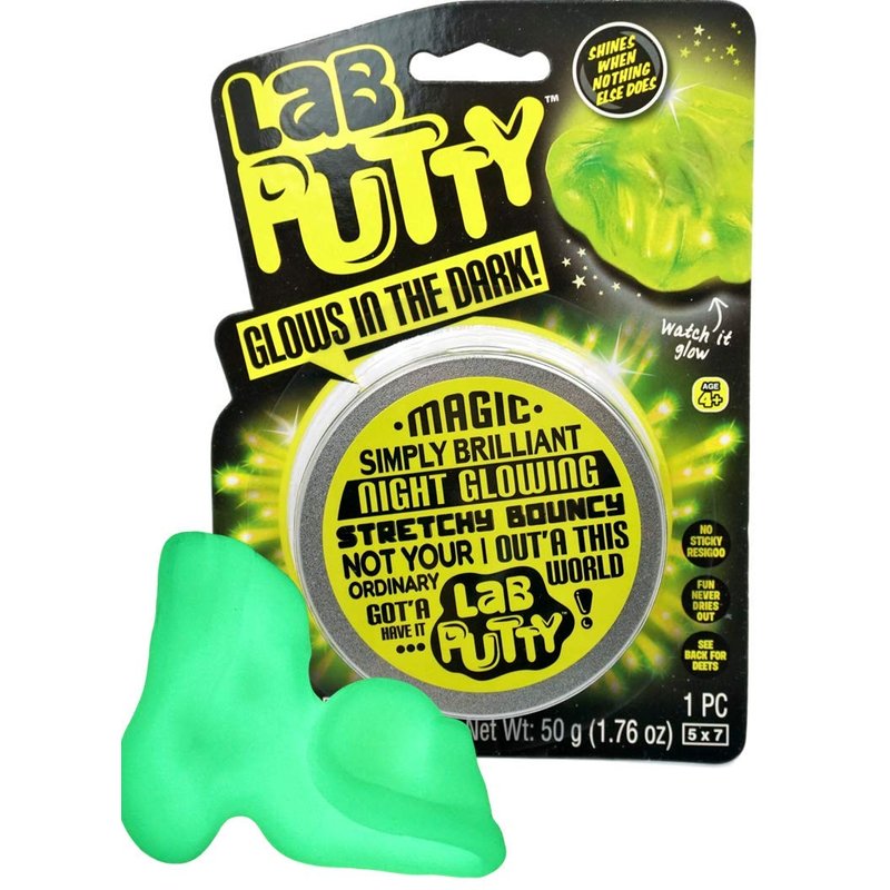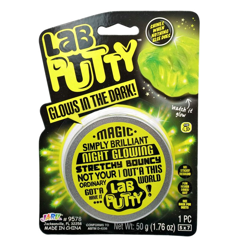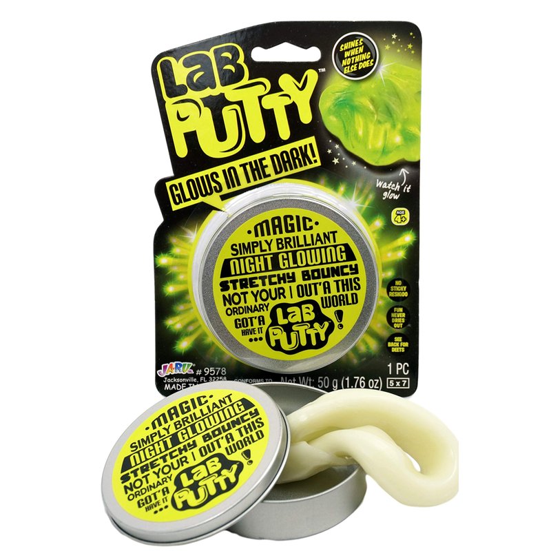 - 1 Pack of Lab Putty Glow in the Dark Putty - Each pack comes with a tin container. Put the slime under the light for few minutes and watch it glow in the dark. Cool slime for boys and girls. Plus 1 JA-RU Bouncy Ball.