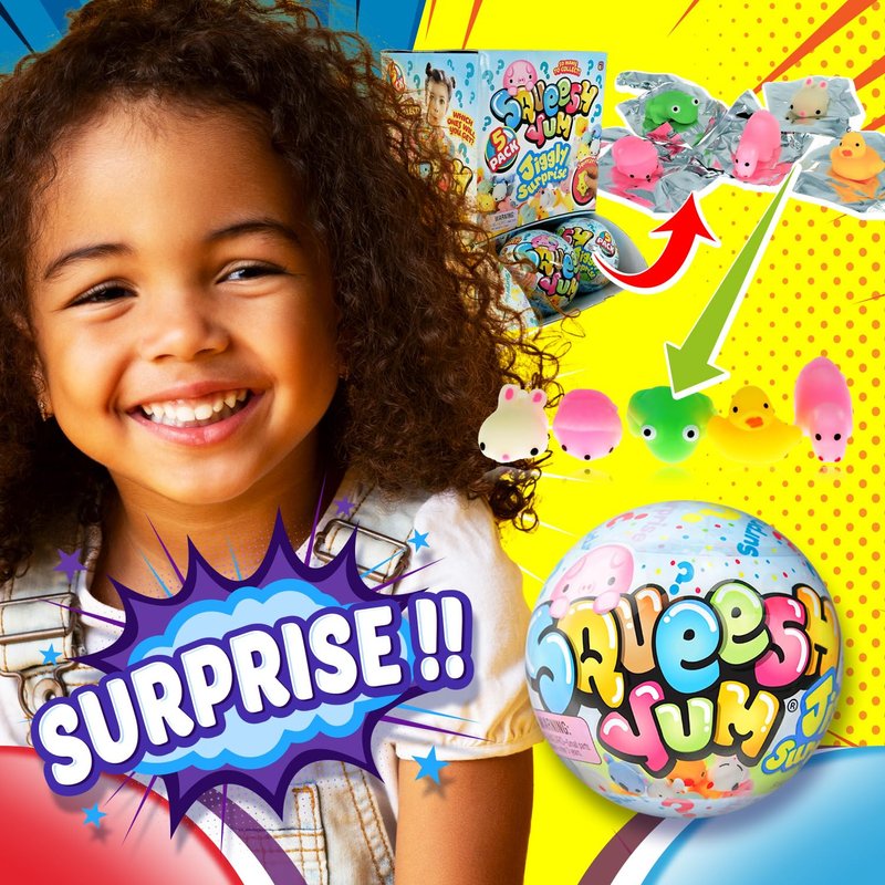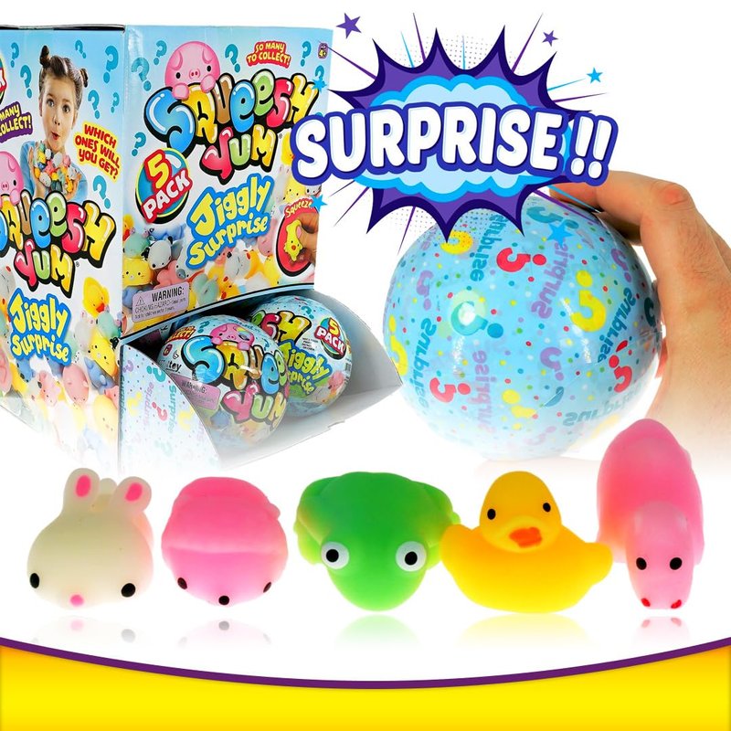- 1 Mystery Ball of Jiggly Surprise Mini Mochi Squishies - Get a delightful variety of small squishy animals in one pack. Each mystery ball contains 5 assorted animal squishies (frog, rabbit, dog, duck, & cow). Plus 1 JA-RU Bouncy Ball.