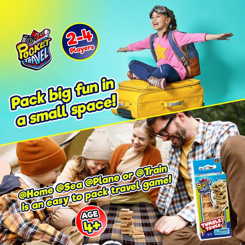 - 3 Pack of Pocket Travel Mini Tumble Tower - These tumbling tower blocks toy is small and portable, convenient 4 inch size. The tower game for kids & adults. Family Board games. Includes 1 Funaton Bouncy Ball.