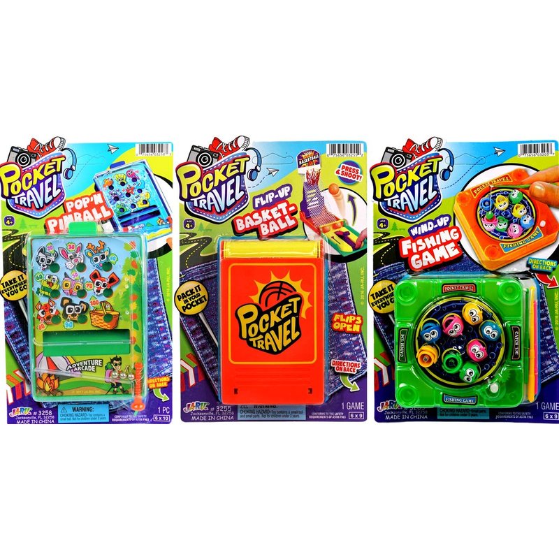 - 3 Toy Bundle of Pocket Travel Handheld Games - Each set includes 3 different arcade game (1 finger basketball game, 1 hand pinball game, and 1 magnetic fishing game). Includes 1 Bouncy Ball by JA-RU