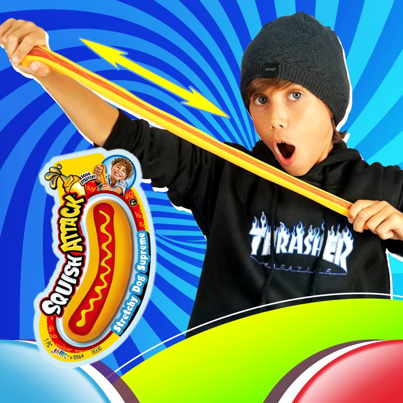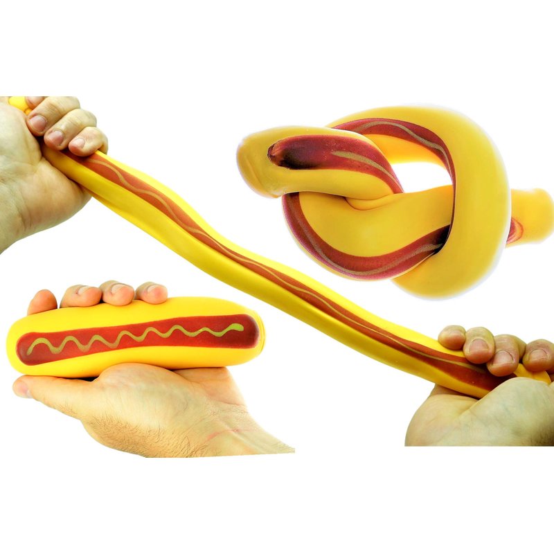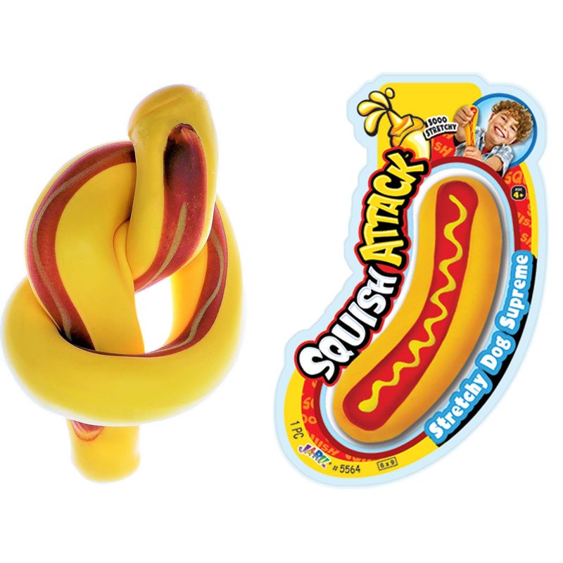 - 1 PACK OF SQUISH ATTACK STRETCHY HOTDOG - Just like the squeesh yum Banana Stress Toy, the Hotdog Fidget toy is also super squishy and stretchy. Fun and stress relieving for both kids and adult.