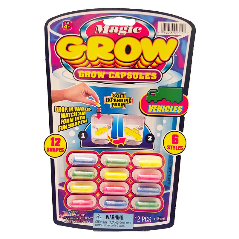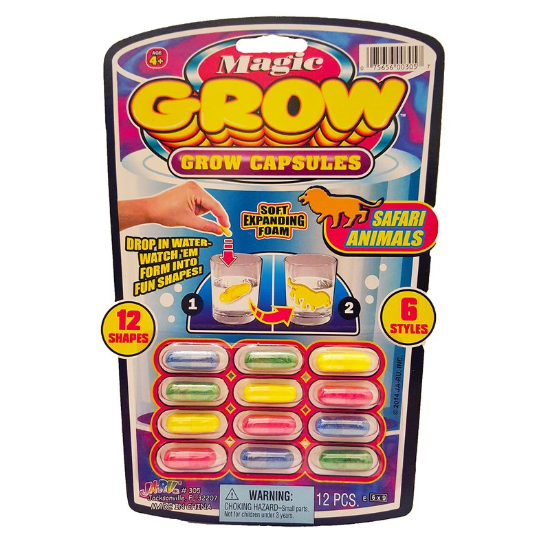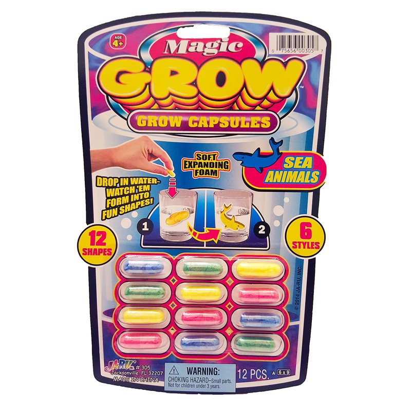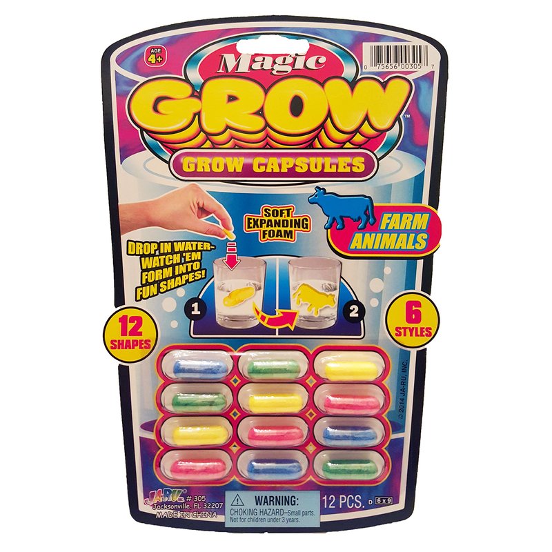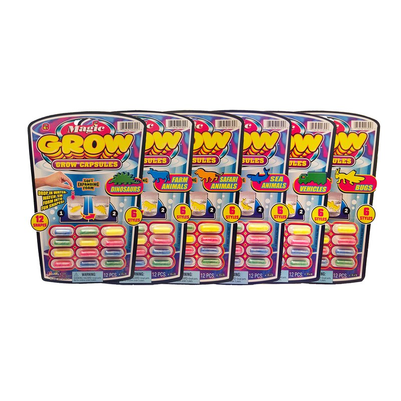 - 6 PACK OF MAGIC GROW CAPSULES (72 CAPSULES TOTAL) - Each pack includes 12 water growing capsules. Comes in random assorted styles (Zoo Animals, Farm Animals, Sea Creatures, Dinosaur, Cars).