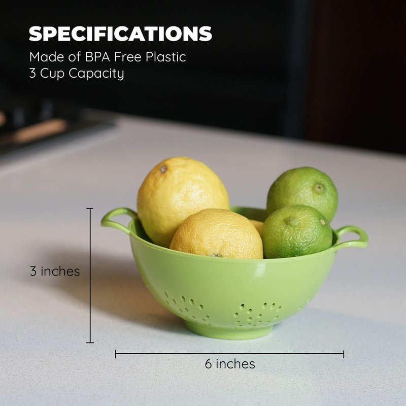 - SPECIFICATIONS: Made of BPA free food grade plastic, this colander has a 3 cup capacity.