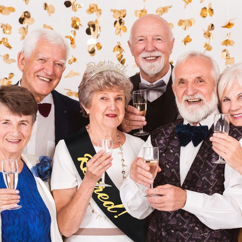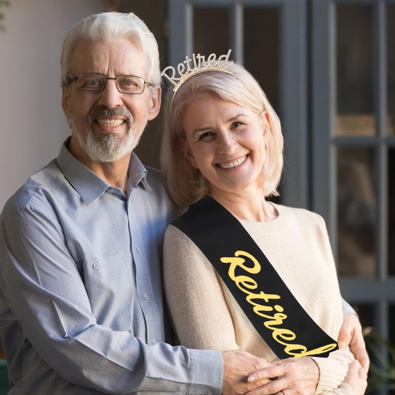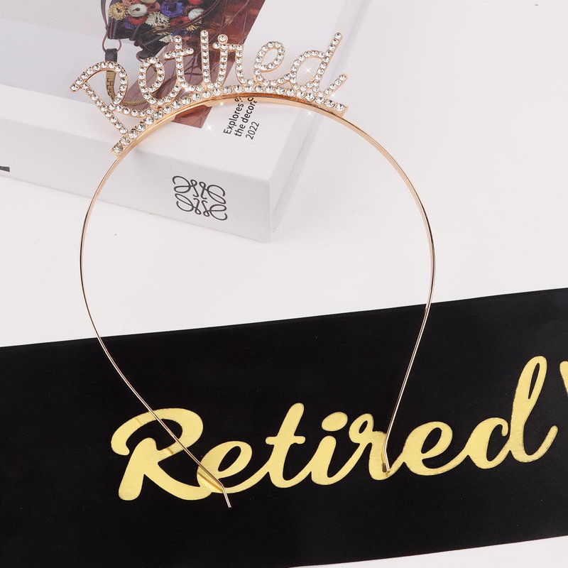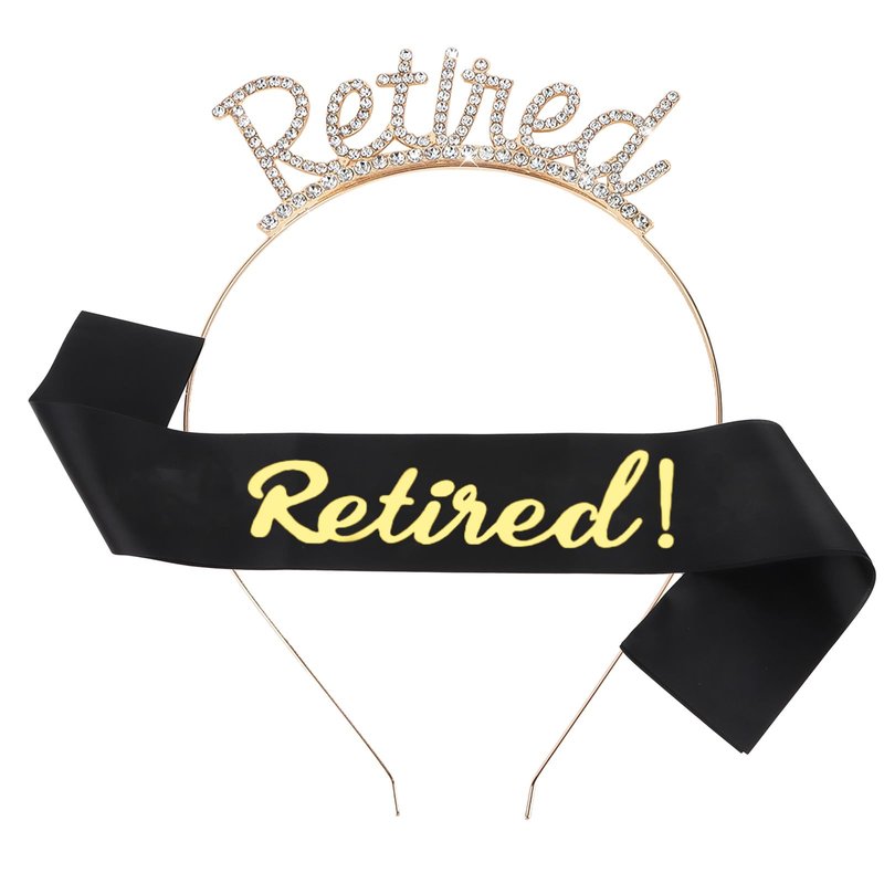 Retirement party decorations: gold retired headband + Officially Retired black sash. Chic and sophisticated design, gorgeous color and brightness. The headband is studded with lots of rhinestones to make you shine like a star at the party.