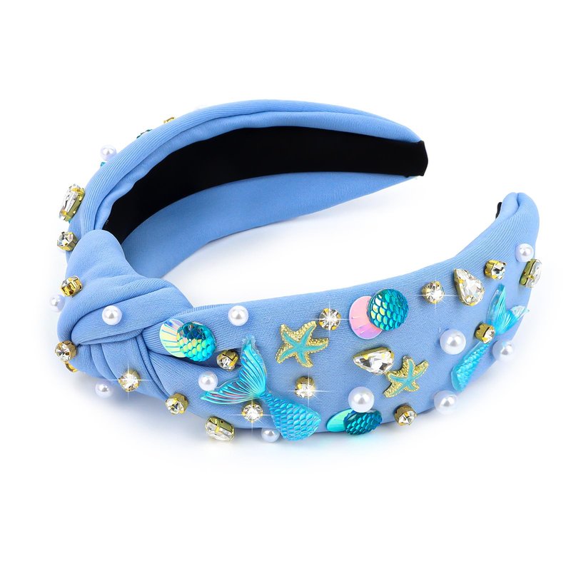 Jaciya Pearl Headband for Girls Rhinestone Headband for Women Wide Knotted Blue Headband for Women Starfish Head Band Mermaid Birthday Party Decorations
