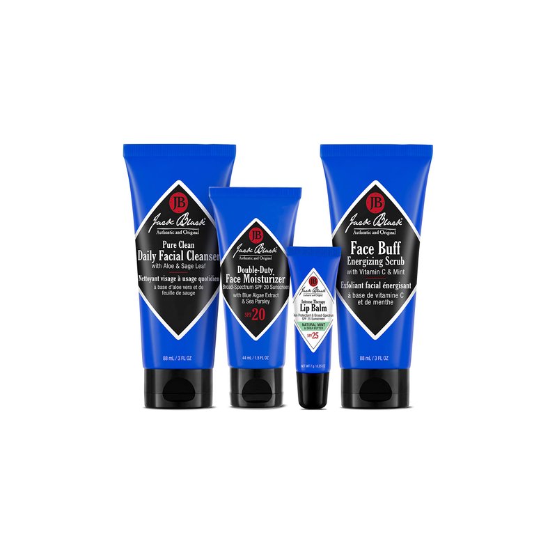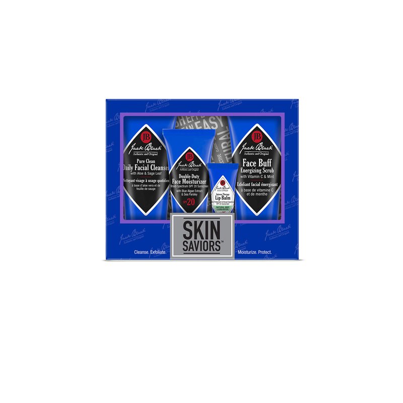 Jack Black Skin Saviors Set – Pure Clean Daily Facial Cleanser, Double-Duty Face Moisturizer SPF 20, Intense Therapy Lip Balm SPF 25 Natural Mint & Shea Butter, & Face Buff Energizing Scrub