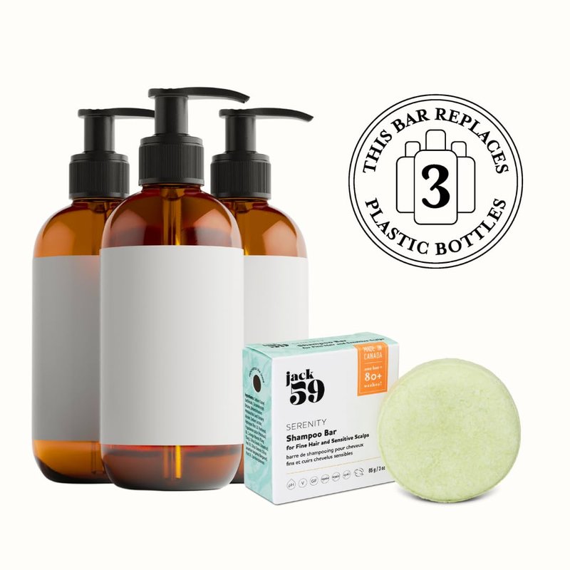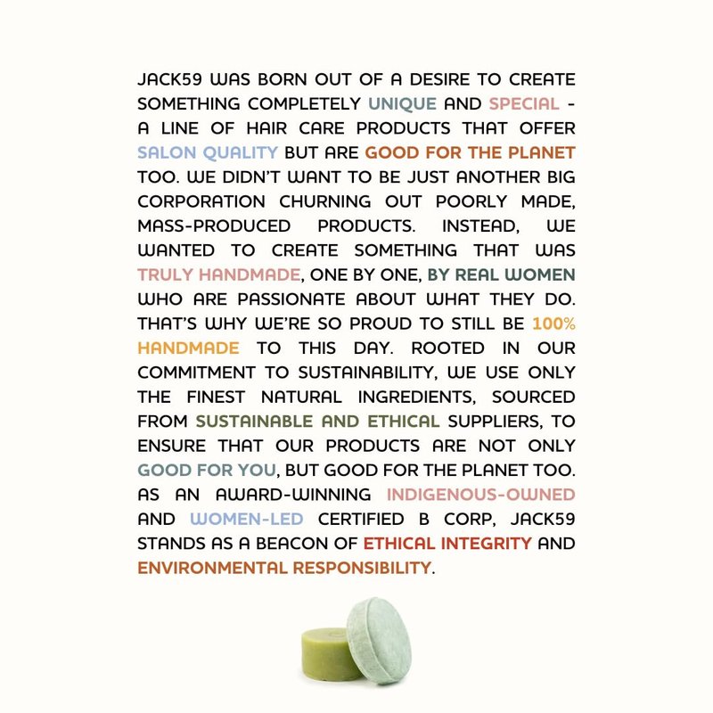 If you experience an itchy scalp then you will love this bar. The refreshing citrus Bergamot and tangy Blood Orange combined with the deep earthy aroma of Patchouli and Ylang-Ylang make this a pleasant and soothing blend to create a relaxing atmosphere in your personal environment. Jack59 plastic-free shampoo and conditioner sets for really good hair days! We believe in quality shampoo and conditioner bars without compromise. More than 552 million shampoo bottles end up in the landfill each year. We all have the ability to change those statistics by purchasing products that do not use plastic. Each Jack59 shampoo bar eliminates up to 3 plastic bottles – together we can reduce plastic waste. Because our bars are bigger, you’ll be buying shampoo and conditioner bars less often and reducing your carbon footprint. Jack59’s shampoo bars are handmade with natural ingredients – Mother Nature provides the basis for our bars including essential oils, plant proteins and botanical extracts. Our shampoo bars are made locally in Canada. Join the movement to better hair and a cleaner planet.