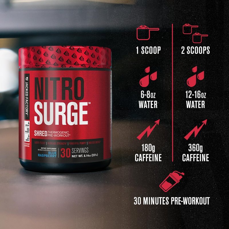Nitrosurge shred is the best pre workout supplement for men and women. As a mens pre workout, Nitrosurge shred combines effective ingredients like caffeine powder, beta alanine, and acetyl l-carnitine that are backed by science and clinical research. The ultimate energy supplements for women and men. Nitrosurge shred is a pre workout men with nitric oxide boosters. If you want a pre-workout for men or women Nitrosurge shred has you covered. One of the best sports nutrition pre-workout products on the market, with caffeine powder. Jacked Factory's body recomposition preworkout for men. The greatest energy drink powder with thermogenic ingredients available. Take your work out to the next level with a quality pre workout from Jacked Factory. Nitrosurge shred has caffeine energy powder to help you power through your next workout, smash personal bests, and gain muscle mass. Nitrosurge Shred Thermogenic pre workout is the ultimate thermogenic pre workout and energy supplements for women and men. Jacked Factory Nitrosurge shred pre workout is the pinnacle of thermogenic sports nutrition pre-workout powders. If you are looking for a pre workout that helps you hit every gym session hard Nitrosurge Shred, thats why its the best rated pre workout supplement with thermogenics. This pre-workout has everything you need in a thermogenic mens and womens preworkout because its an energy booster for women and men. Nitrosurge Shred is the best pre workout to help you hit your body recomposition goals, it has effective ingredients like l-citrulline, beta alanine, and acetyl l-carnitine. Nitrosurge Shred men and women prework out is also an effective nitric oxide powder to help increase blood flow during your workouts. If you are looking for an effective pre workout for men and blood flow supplement for men then Nitrosurge Shred thermogenic pre workout is the best pre workout for your goals