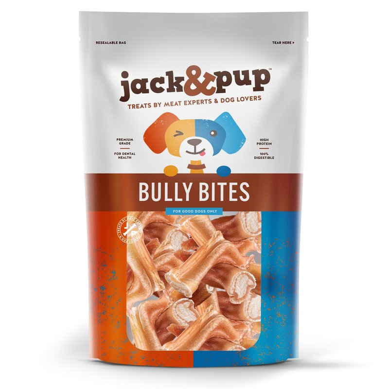 - Variety Of Sizes & Shapes - Jack & Pup Premium Grade Bully Bites Dog Treats is a natural, low-fat and protein-rich, one-ingredient dog chew, being 100% beef muscle without any fillers, additives or artificial ingredients. Made from chunks of fresh bully sticks in a variety of shapes and sizes; from one (1) inch to 3+ inches. Keep your dog occupied for many hours, while chewing away on this savory beefy and flavorful dog treat!