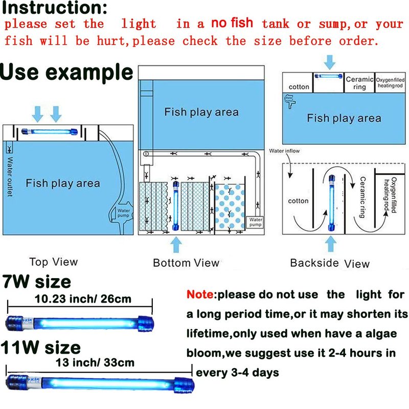 - 7 Watt aquarium water clean light,Suitable for Freshwater and Saltwater,suggest that use the light 3-4 hours once in 2-5 days.