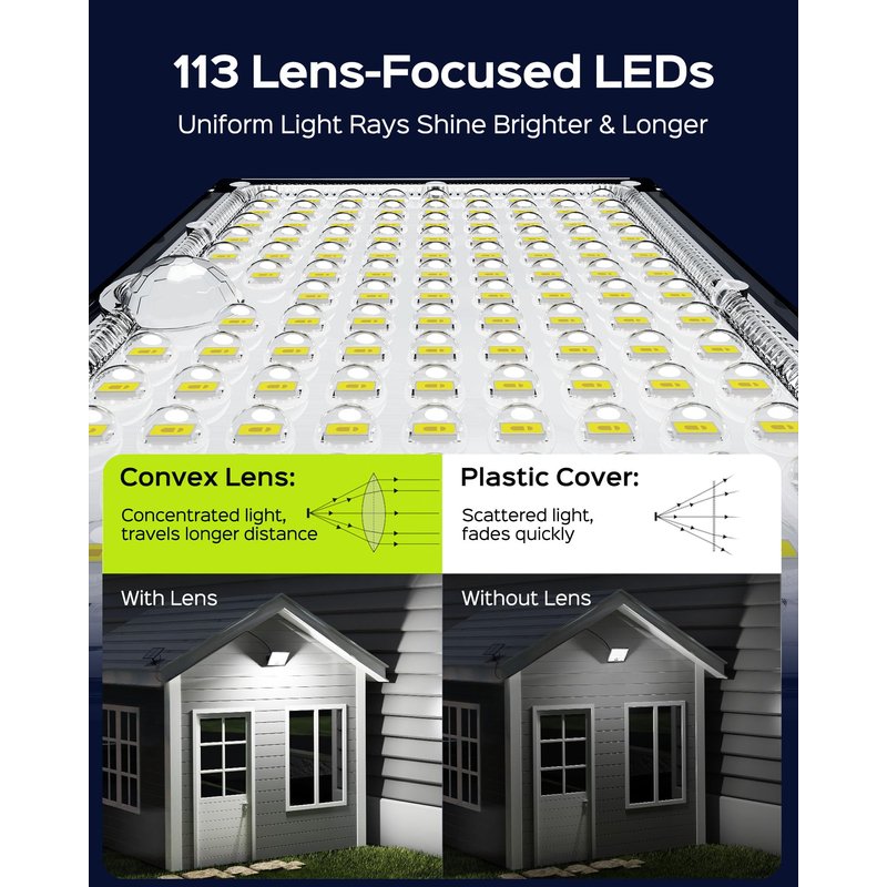 - [ Brighter Illumination ] - The dusk to dawn solar lights waterproof for outdoor are built in with 113 LEDs that are covered with convex optical lenses, providing a cool white brighter and more concentrated light distribution. Compared to those without lenses, our solar spot lights outdoor create a much brighter ambience.