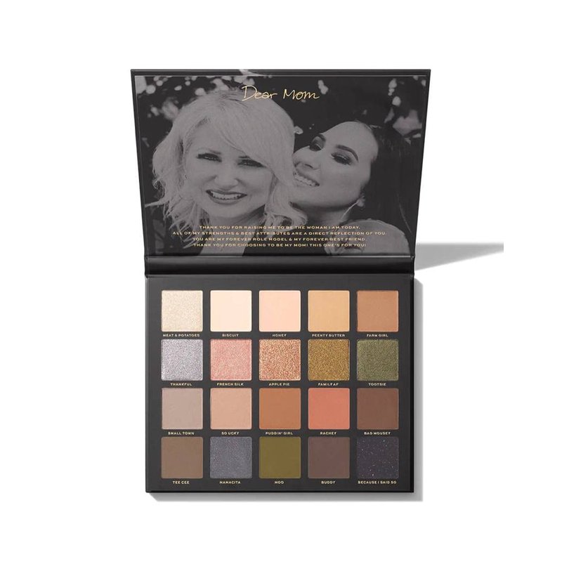 Shades included: Meat & Potatoes (shimmer champagne) Biscuit (matte eggshell) Honey (matte cream) Peenty Butter (matte taupe) Farm Girl (matte light brown) Thankful (metallic silver) French Silk (shimmer pink-gold) Apple Pie (metallic gold) Family AF (shimmer bronze) Tootsie (shimmer olive) Small Town (matte dove gray) So Ucky (matte gray-brown) Puddin’ Girl (matte burnt caramel) Rachey (matte terra-cotta) Bad Mousey (matte chocolate brown) Tee Cee (matte medium-gray) Mamacita (matte charcoal gray) Moo (matte army green) Buddy (matte dark chocolate) Because I Said So (matte black) *** HOW TO USE Achieve a wash a color with the matte shades with a fluffy brush, switching to a detail brush to build intensity, for extra precision, and smokiness. Achieve memorable shine with the shimmer and metallic shades by layering them over a matte shadow with a flat brush, then on the inner corner of your eye or brow bone with a clean detail brush.