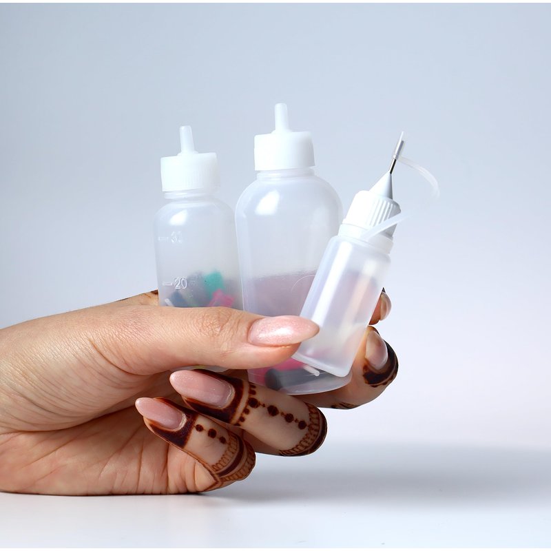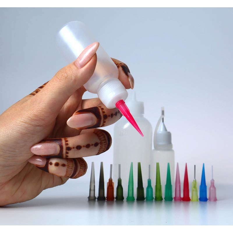 - PACKAGE INCLUDES: 3 Bottles (50ml, 30ml, 10ml) + 12 Nozzles(different size) + 20 empty pre-rolled henna cones