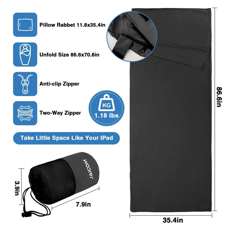 - 𝑩𝒂𝒄𝒌 𝒑𝒊𝒍𝒍𝒐𝒘 𝒄𝒐𝒎𝒑𝒂𝒓𝒕𝒎𝒆𝒏𝒕 - The innovative pocket on the back of the sleeping bag liner not only fixes the pillow in place, but also keeps you hygienically clean by not coming into contact with other sheets. The versatile zipper of the sleeping bag can be fully opened to get a large travel sheets (86.8 x 70.8 in).