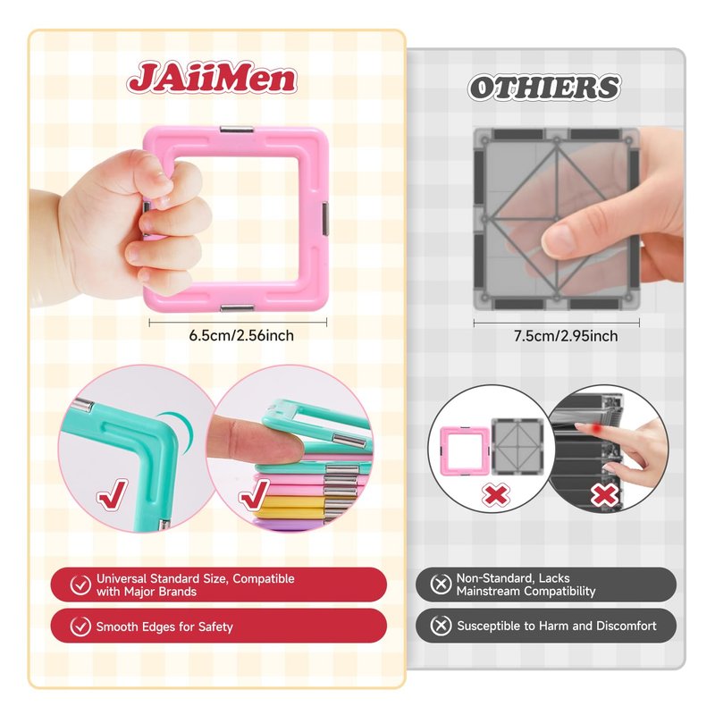 - Enhances Fine Motor Skills and Coordination: Assembling and manipulating our JAiiMen Magnetic Tiles helps improve children's hand-eye coordination and fine motor skills, which are crucial for their overall development. Through building various shapes and structures, they help children learn basic geometric shapes, math concepts, and physics principles while playing.