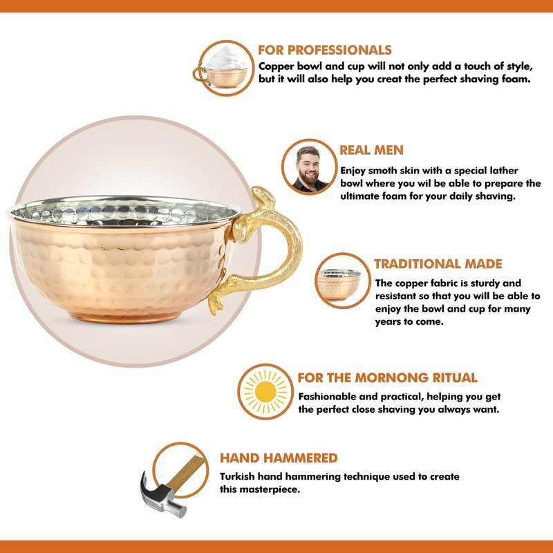 - FOR PROFESSIONALS: If you have transformed your passion into a business and you enjoy running a barber’s shop, then you know how important it is to have the right utensils in order to have a precise and safe cut. That is why we believe that the copper bowl and cup will not only add a touch of style, but it will also help you create the perfect shaving foam.