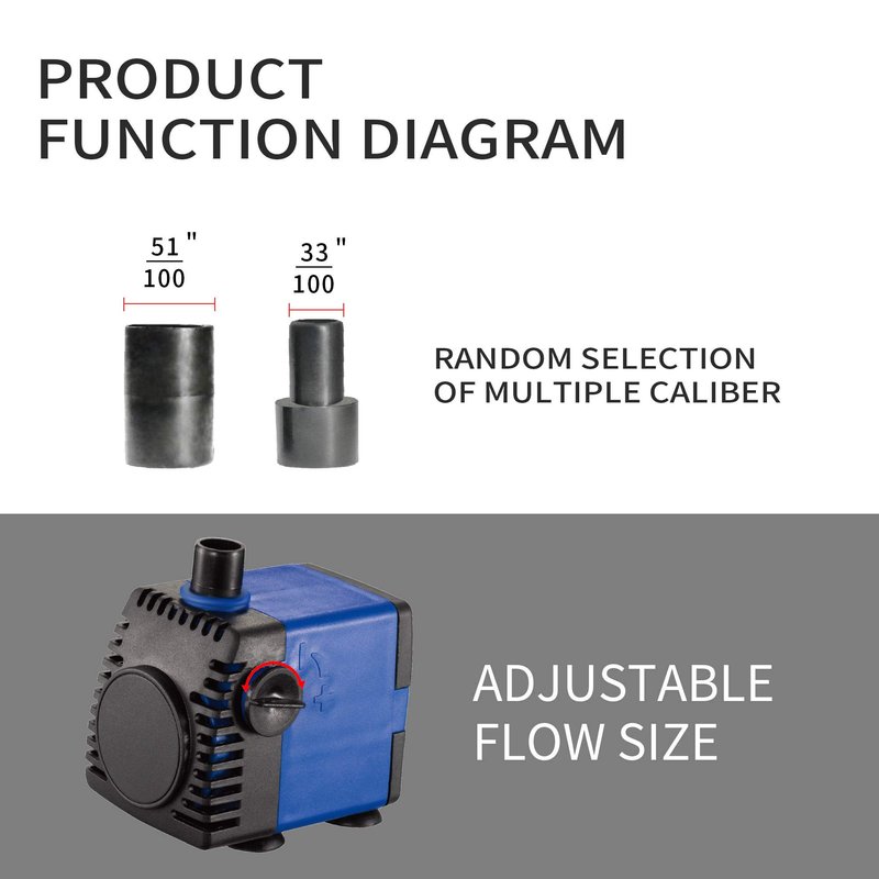 - The submersible pump is designed for fish tanks, ponds, fountains, waterfalls, hydroponic systems, irrigation systems, and water features. Equipped with two nozzles, one with a diameter of 1/4" and the other with a diameter of 1/2", providing different water flow effects.