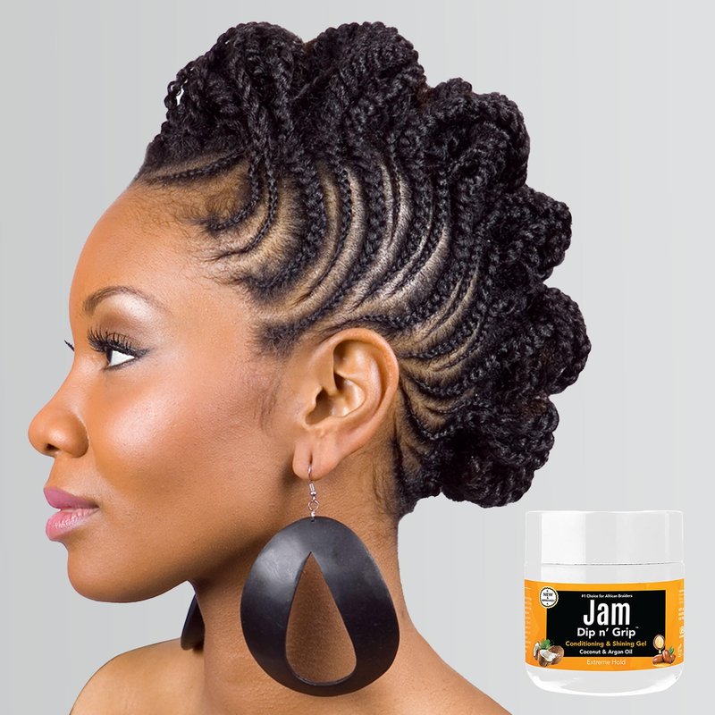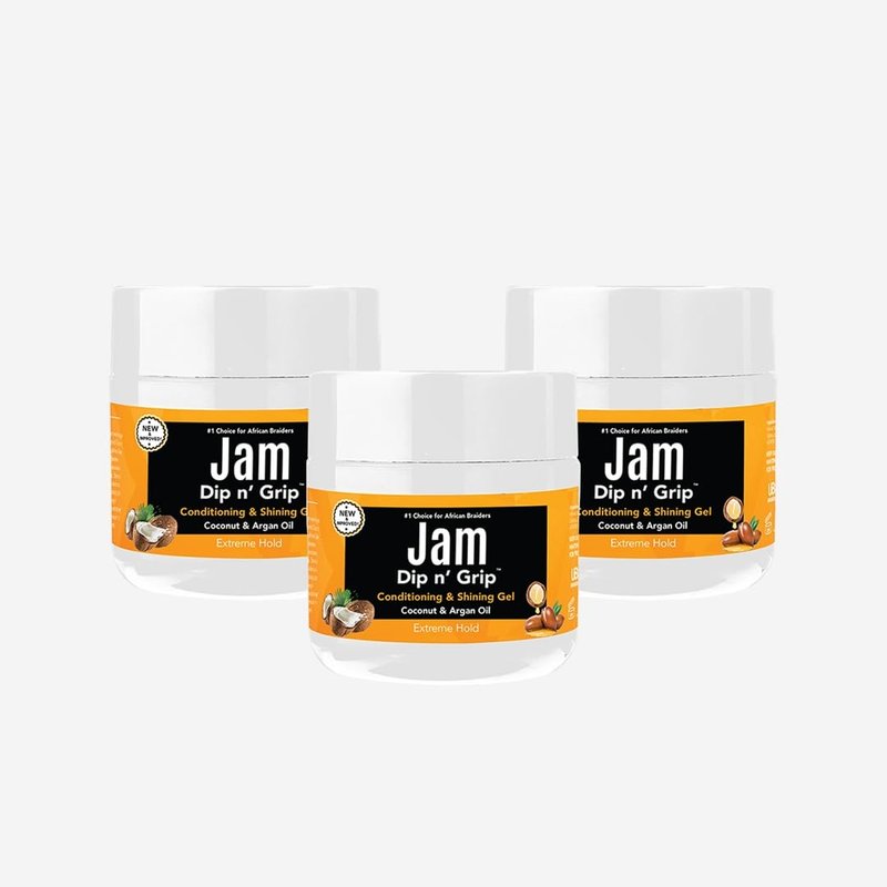 Jam Dip n Grip Hair Care Conditioning & Shining Gel. This 4oz gel provides extreme hold and high shine, perfect for taming frizz and defining your style. Infused with nourishing Argan Oil, Coconut Oil, Vitamin E, and Castor Oil, this versatile gel delivers deep conditioning and a radiant shine for all hair types. Jam Dip n Grip ensures your hair stays sleek and controlled. To use, simply scoop out a small amount with your hand and apply it to your hair, working it from the scalp outward. Separate your hair into sections and twist each section using a hand twist, comb twist, or double twist technique to achieve your desired look. Jam Dip n Grip. Its powerful formula not only holds your style in place but also nourishes your hair, promoting health and vitality. Say goodbye to frizz and hello to stunning, shiny hair that lasts all day. Whether you're going for a polished professional look or a creative protective style, Jam Dip n Grip is your go-to solution for impeccable hair.