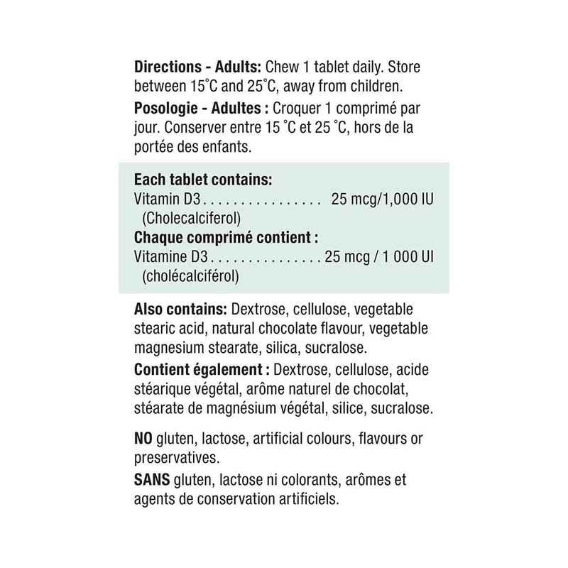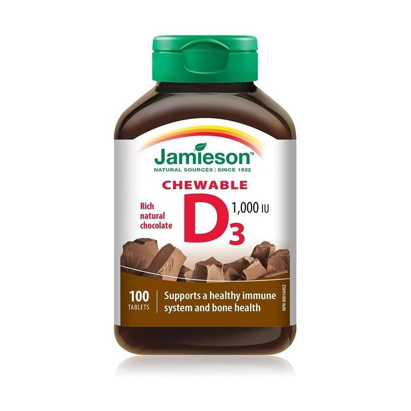 Jamieson Vitamin D Chewable 1,000 IU is a delicious chocolate flavoured chewable tablet. Vitamin D plays a key role in the maintenance of good health.