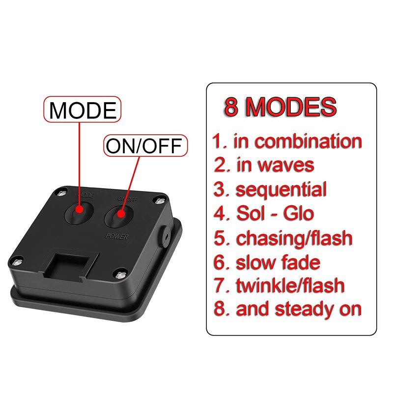 Combination, In waves, Sequential, Slow Glow, Chasing/Flash, Slow fade, Twinkle/Flash, Steady on.