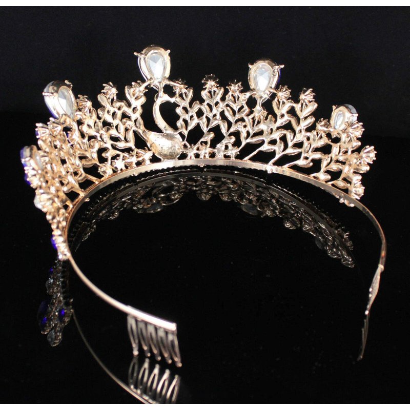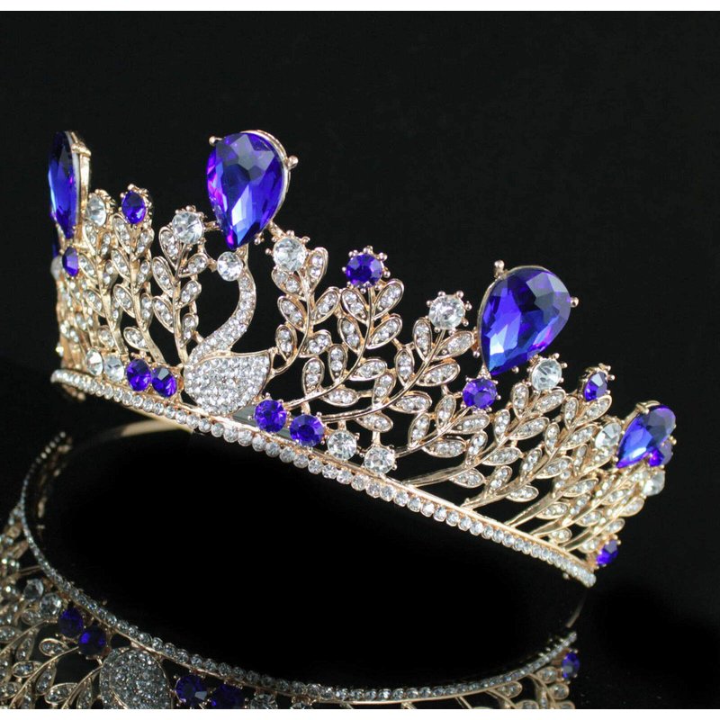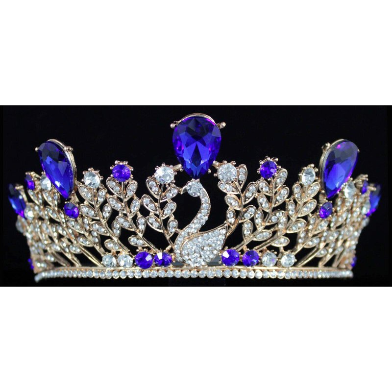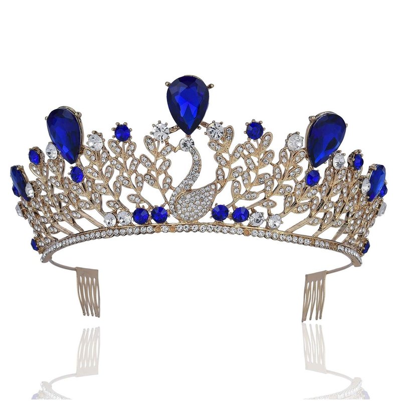 - This is gorgeous swan Austrian rhinestone tiara crown with side combs. Glittery Clear and Royal Blue Austrian rhinestones are heavily set on Gold-plated metal. All rhinestones shine a lot! Sides hair combs for extra security. This tiara is perfect for wedding, party, prom, pageant or any special occasions!